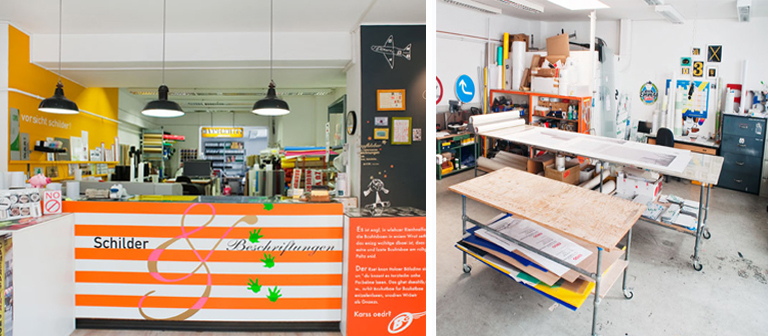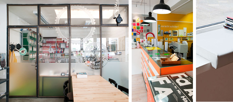 Umbau einer Firma für Werbetechnik. Strukturierung der großen Ladenfläche in Verkauf und Beratungsbereiche sowie der Werkstatt und des Büros.