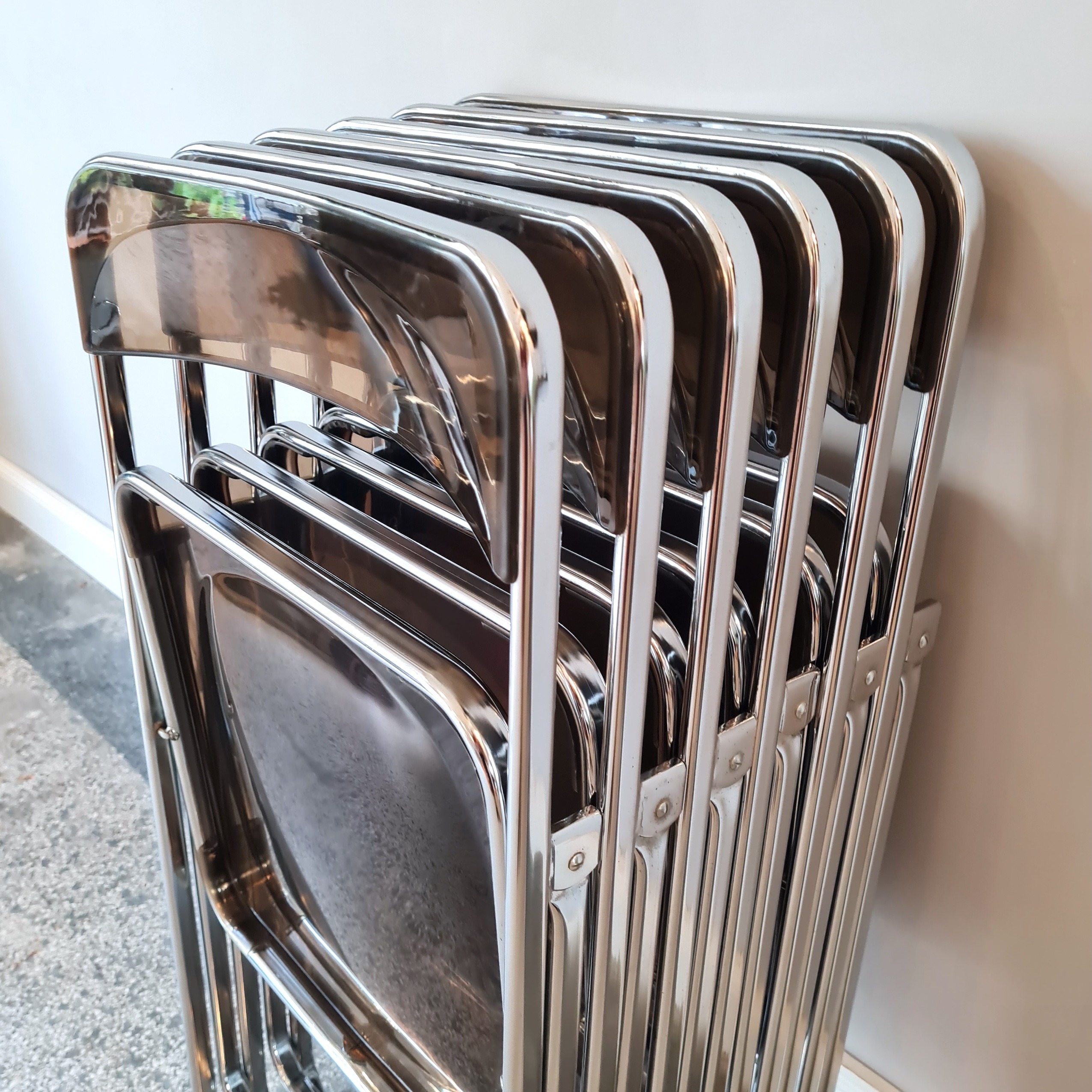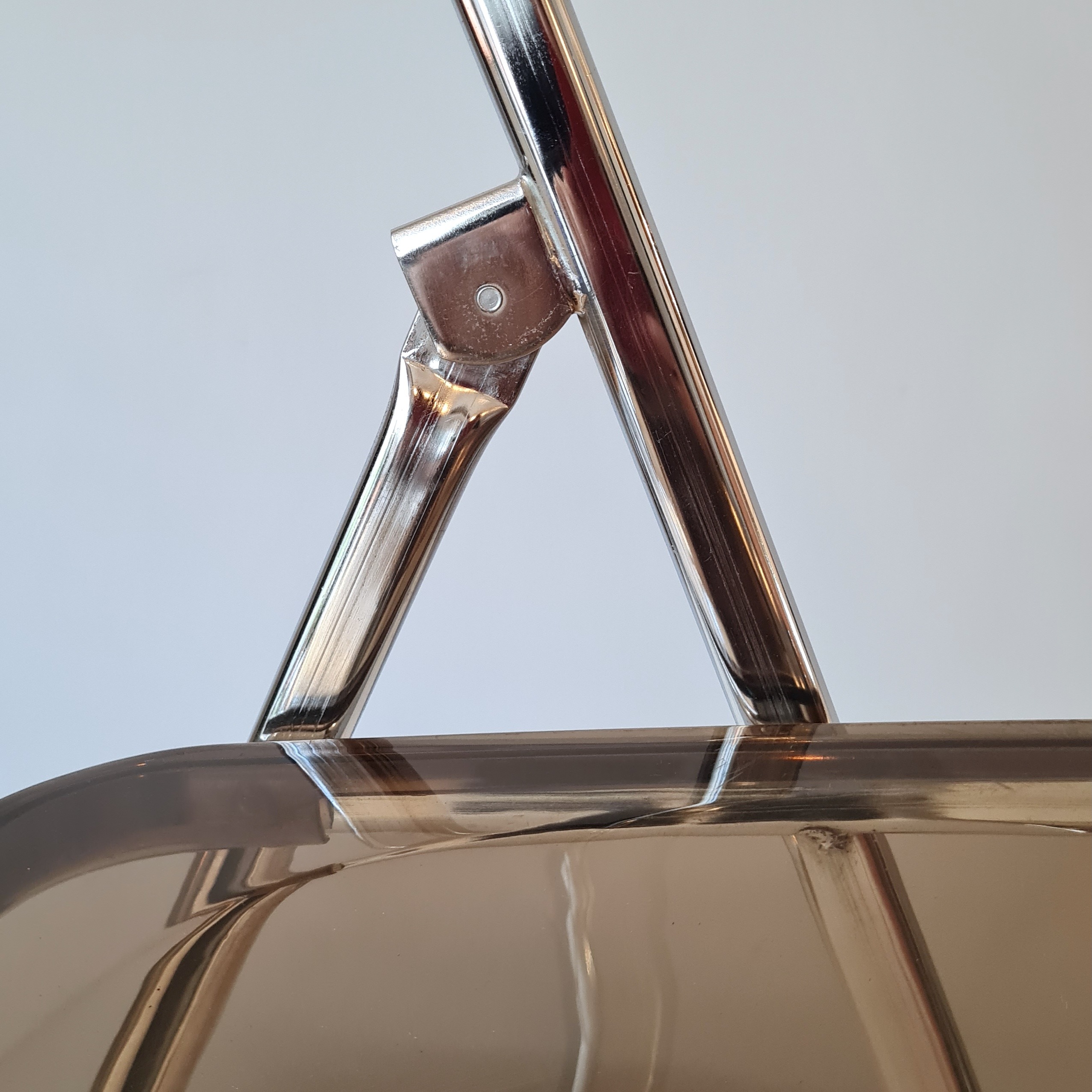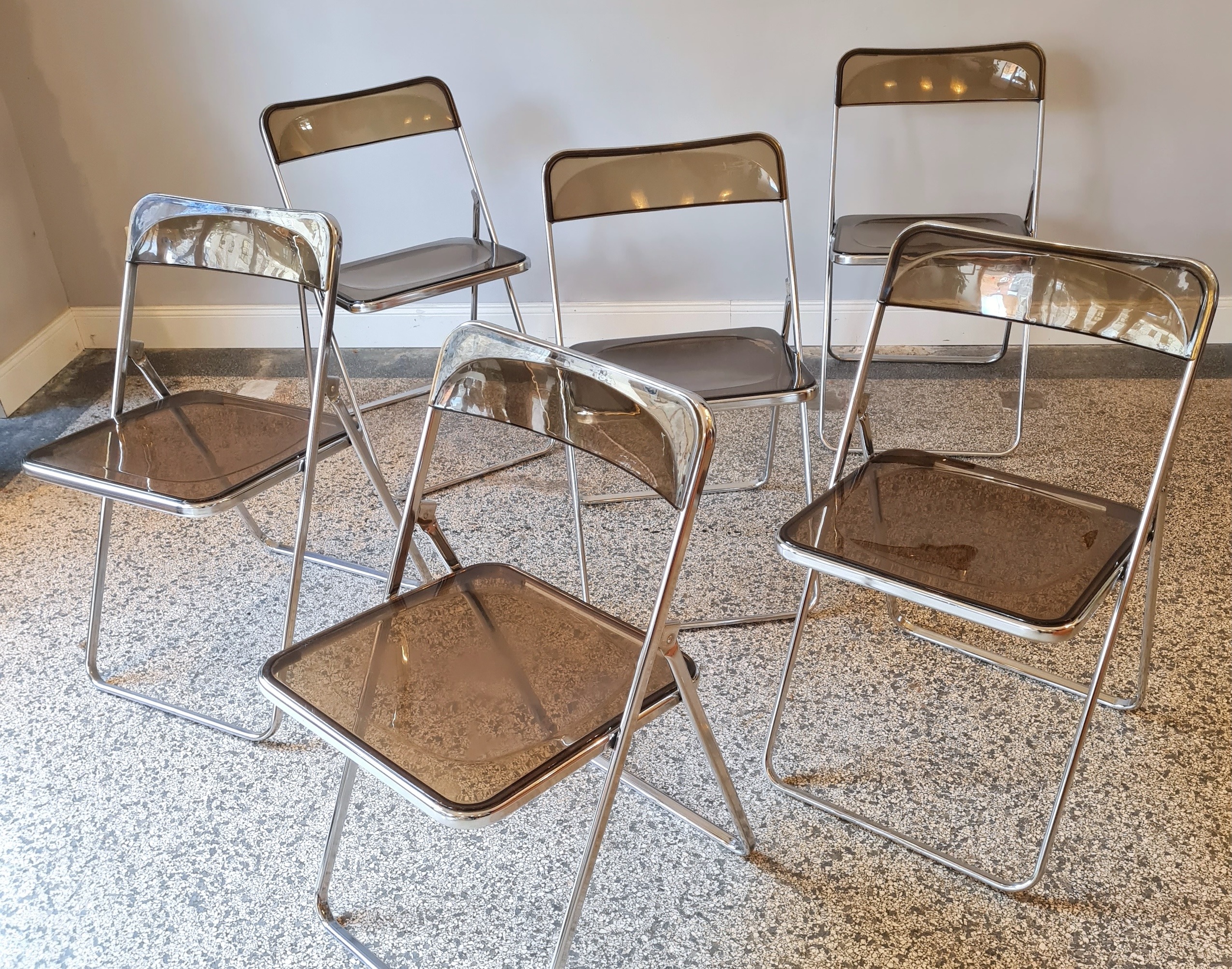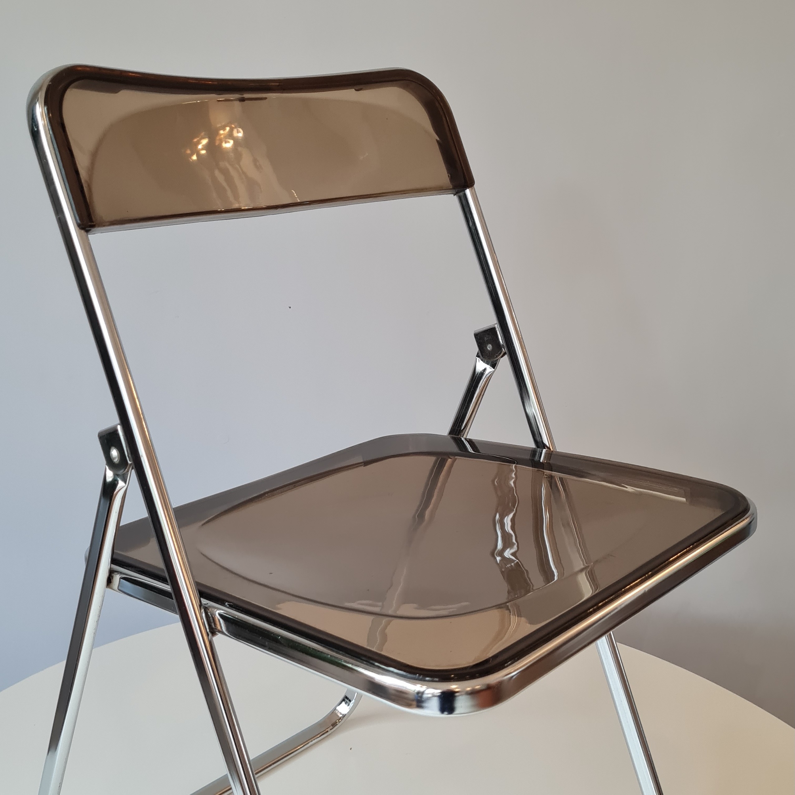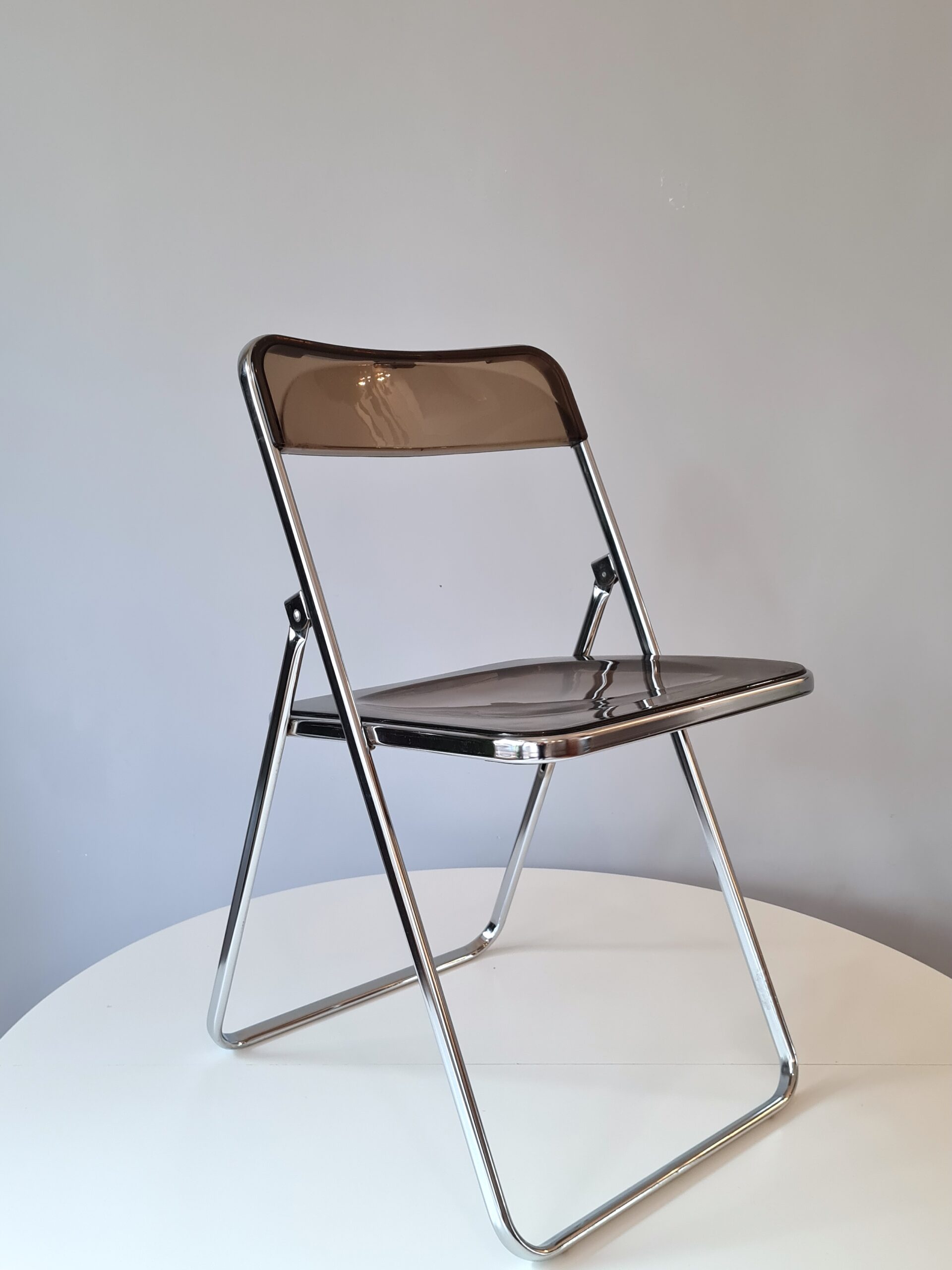 Die stilvollen Klappstühle bringen den ikonischen Look der 80ths in Ihr Zuhause. Mit der rauchbraunen transparent Sitzfläche und Rückenlehne aus Plexiglas und dem glänzenden Chromgestell verkörpern sie die Ästhetik eines Designklassikers – ganz im Stil des berühmten „Plia“ Stuhls von Giancarlo Piretti für Castelli. Leicht, funktional und dabei absolut elegant.
